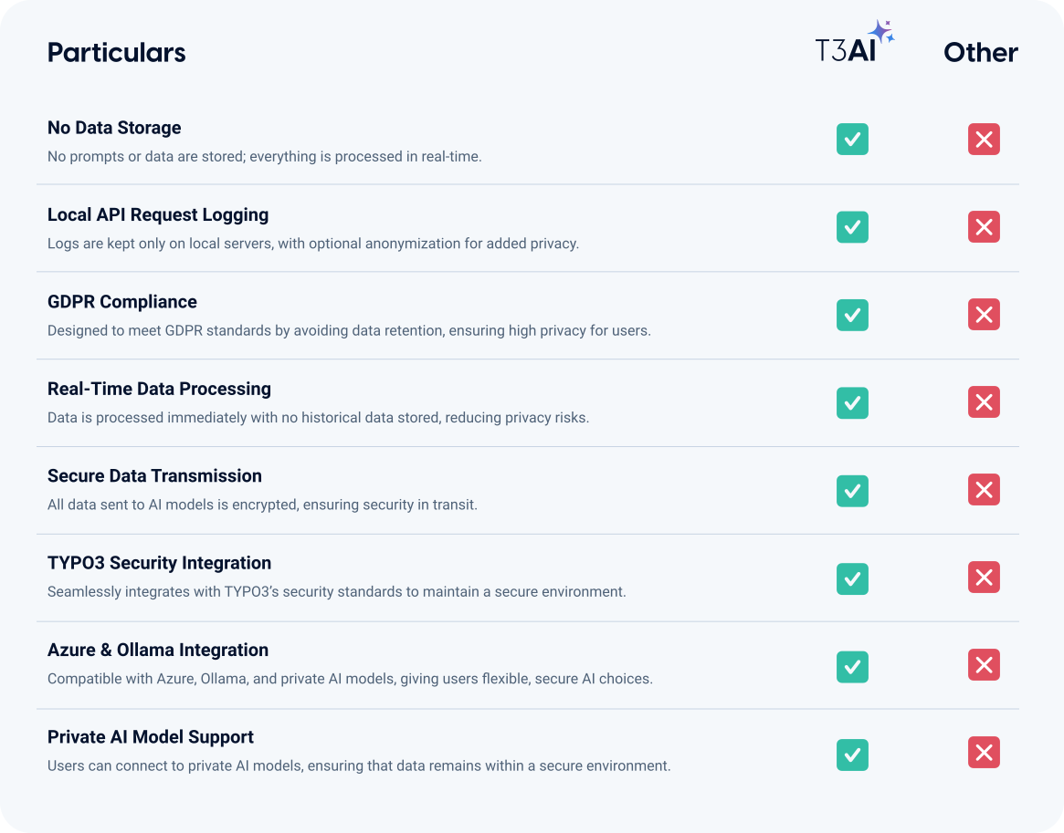 Mit TYPO3 AI Lösungen wie der T3AI Extension kannst du diese Bedenken hinter dir lassen. Im Gegensatz zu vielen allgemeinen AI Tools legt TYPO3 AI großen Wert auf Sicherheit und setzt auf datenschutzorientierte Modelle wie Ollama. Das bedeutet, deine Daten bleiben geschützt, werden niemals für Trainings durch Dritte verwendet und bleiben jederzeit vollständig unter deiner Kontrolle.