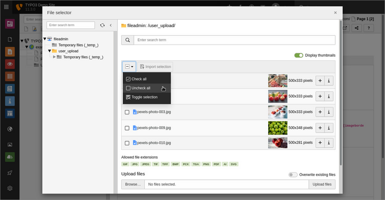 Die Datensatzauswahl wurde mit TYPO3 v11.3 vereinfacht. Der Datei-Selektor zur Auswahl eines Bildes im Inhaltselement "Text und Medien" verfügt nun über eine Checkbox auf der linken Seite für jede Datei. Backend-Benutzer können Elemente einfach an- und abhaken bzw. umschalten.