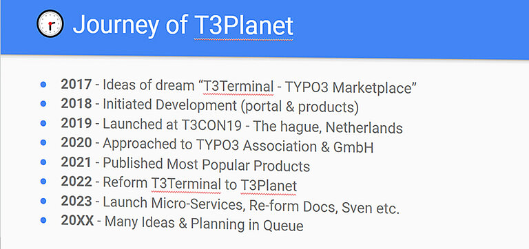 T3Planet was founded four years ago with a simple yet powerful mission: to provide a platform that encourages people to explore, learn, and connect. Over the past four years, we've witnessed incredible growth, learned valuable lessons, and built a strong and vibrant community of TYPO3 users. We've expanded our services, listened to your feedback, and evolved to meet your needs. Our commitment to fostering creativity, innovation, and learning has remained at the core of what we do.