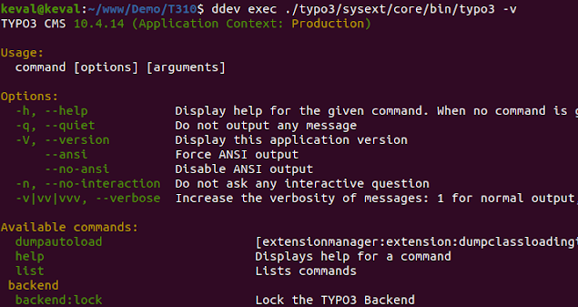 ddev exec ./typo3/sysext/core/bin/typo3 -v