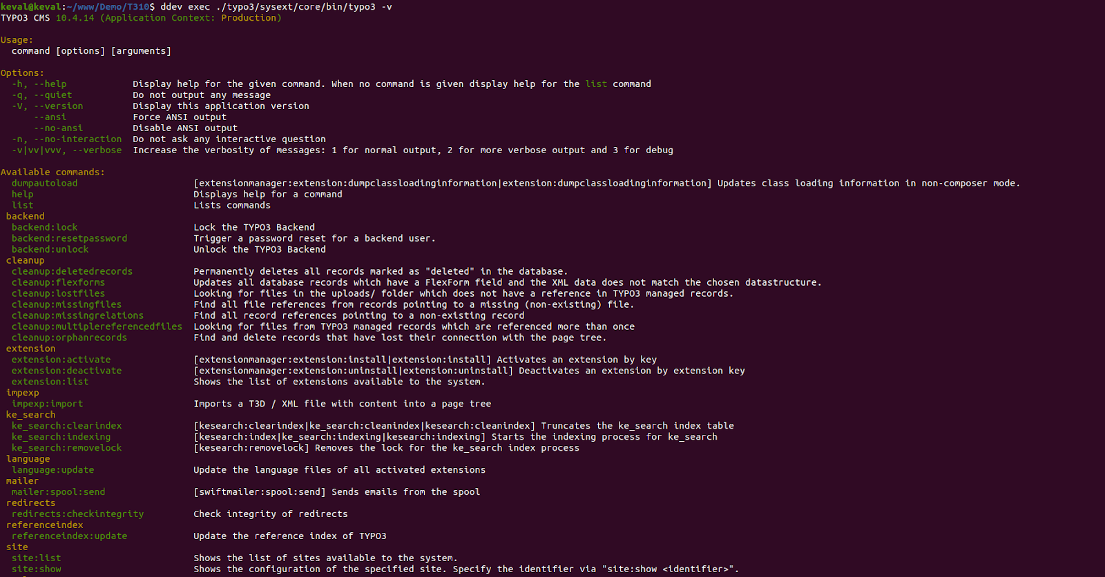ddev exec ./typo3/sysext/core/bin/typo3 -v