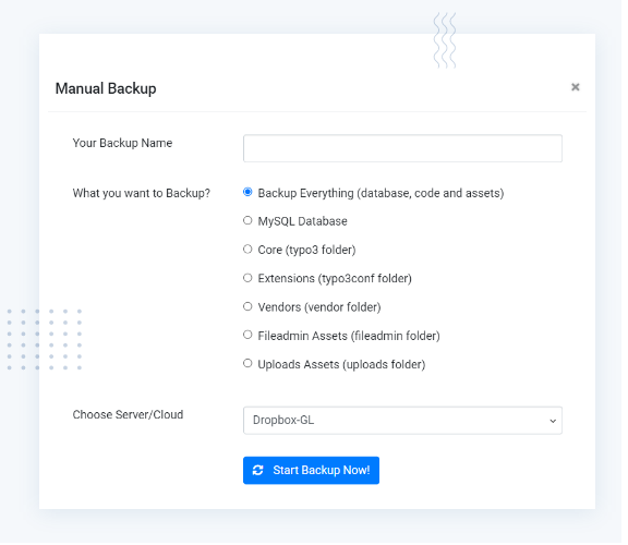 Die TYPO3-Backup-Plus-Erweiterung ist die allererste Komplettlösung für die Sicherung von TYPO3. Sichern Sie Ihren TYPO3-Code, Ihre Assets und Ihre Datenbank mit ein paar Klicks!
