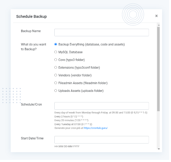 Die TYPO3-Backup-Lösung ist einfach zu installieren und zu konfigurieren, und das mit nur wenigen Klicks. Führen Sie mit einem Klick ein manuelles TYPO3-Backup durch, starten Sie Ihr Backup jetzt. Außerdem können Sie unbegrenzte TYPO3-Backups mit unserer Smart-Scheduler-Funktion planen, die in den neuesten Standard des TYPO3-Scheduler-Kerns und der Symfony-basierten Konsole integriert ist.